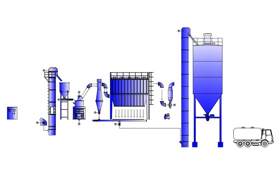 4、集粉階段:符合細度的粉子隨氣流經管道進入集粉系統,氣粉分離,成品粉由輸送裝置送至成品料倉,再統一用裝粉罐車或者自動打包機進行包裝。