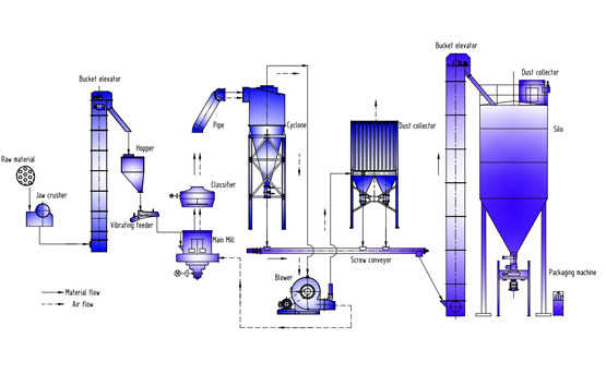 4、集粉階段:符合細(xì)度的粉子隨氣流經(jīng)管道進(jìn)入集粉系統(tǒng),氣粉分離,成品粉由輸送裝置送至成品料倉,再統(tǒng)一用裝粉罐車或者自動打包機(jī)進(jìn)行包裝。