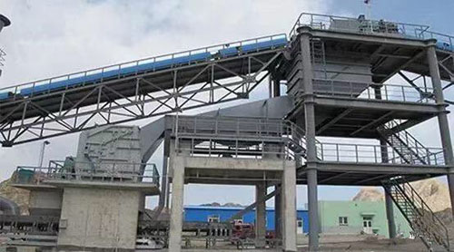 粗破設備有一定的混凝土基礎厚度,其出料口距離下游輸送皮帶機間落差較大,而且粗破后物料塊度多數<300mm,這些石塊直接砸在皮帶機上,會出現將緩沖托輥砸掉、托輥架將輸送帶撕開等現象。