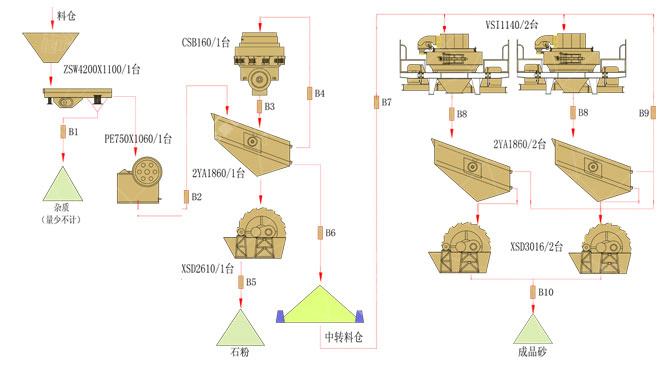 核心設(shè)備主要包括顎式破碎機(jī)、反擊式破碎機(jī)、圓錐破碎機(jī)、制沙機(jī)等設(shè)備組成。