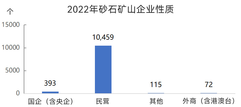 從砂石礦山企業(yè)性質(zhì)來看,國有企業(yè)(含央企)393個(gè),民營企業(yè)較多為10459個(gè),其他類型企業(yè)115個(gè),外商(含港澳臺(tái))企業(yè)72個(gè)。