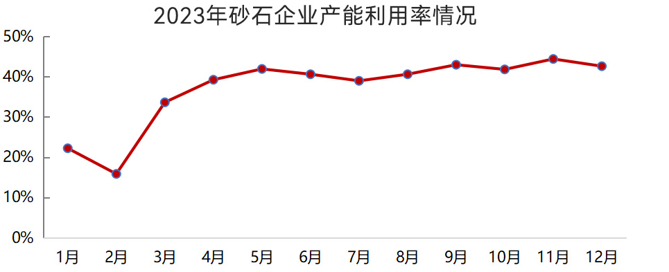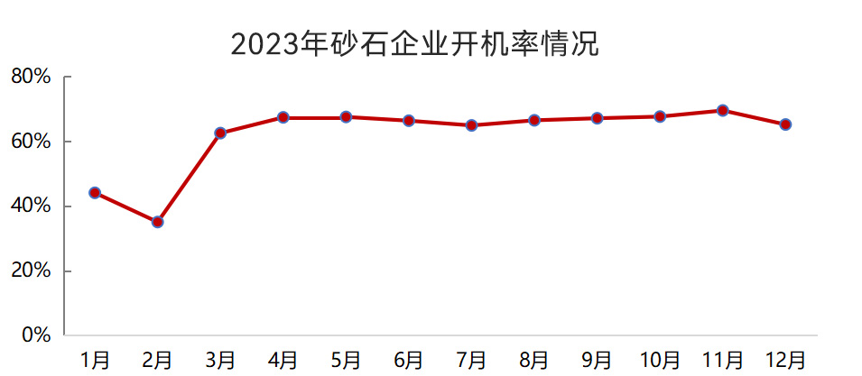 2023年,我國砂石企業(yè)產(chǎn)能利用率和開機(jī)率除了年初低位運(yùn)行以外,其他月份均保持較高水平。1月、2月,我國砂石企業(yè)產(chǎn)能利用率和開機(jī)率均值分別為19%、40%,3月~12月,產(chǎn)能利用率和開機(jī)率均值分別為41%、66%。