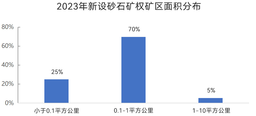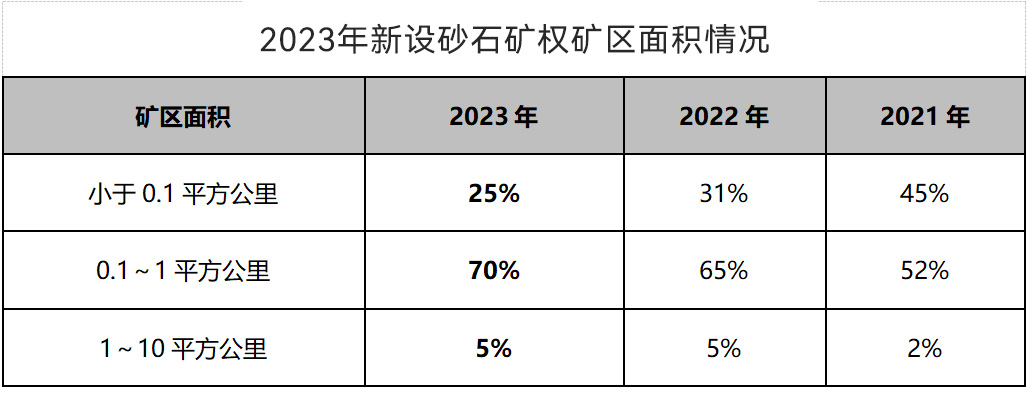 從新設(shè)砂石礦權(quán)礦區(qū)面積來看,砂石行業(yè)規(guī)模化水平進(jìn)一步提升,礦區(qū)面積小于1平方公里砂石礦權(quán)占新設(shè)砂石礦權(quán)70%,成為新設(shè)礦權(quán)的主流。新設(shè)砂石礦權(quán)中,礦區(qū)面積小于0.1平方公里的有228宗,占比為25%,占比較2022年下降6個(gè)百分點(diǎn),新設(shè)小規(guī)模砂石礦權(quán)數(shù)量持續(xù)減少;礦區(qū)面積在0.1~1平方公里之間的新設(shè)砂石礦權(quán)有637宗,占比逐年提升,2023年已經(jīng)達(dá)到70%;礦區(qū)面積在1~10平方公里之間的新設(shè)砂石礦權(quán)49宗,占比為5%。