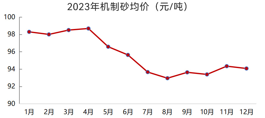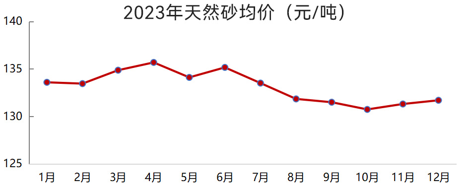 2023年12月,我國機(jī)制砂均價(jià)94元/噸,較年初下降4.3%;天然砂均價(jià)132元/噸,較年初下降1.4%。