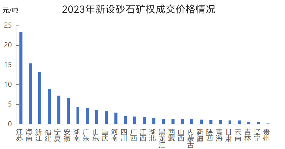 新設(shè)礦權(quán)出讓成交均價(jià)方面,由于各地政府對砂石礦權(quán)出讓的調(diào)控力度和競買人參與競拍的競爭情況不同,我國各省份新設(shè)礦權(quán)出讓成交均價(jià)差異較大。江蘇新設(shè)砂石采礦權(quán)出讓成交均價(jià)為23.5 元/噸,價(jià)格居全國首位;海南、浙江新設(shè)砂石采礦權(quán)出讓成交均價(jià)在10~16元/噸之間;福建、寧夏、安徽新設(shè)砂石采礦權(quán)出讓成交均價(jià)在5~10元/噸之間;湖南、廣東、山東、重慶、河南、四川、廣西、江西、湖北、黑龍江、西藏、山西、內(nèi)蒙古、新疆、陜西、青海新設(shè)砂石采礦權(quán)出讓成交均價(jià)在1~5元/噸之間;甘肅、云南、吉林、遼寧、貴州新設(shè)砂石采礦權(quán)出讓成交均價(jià)在1元/噸以內(nèi)。