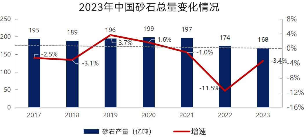2023年國民經(jīng)濟(jì)回升向好,高質(zhì)量發(fā)展扎實(shí)推進(jìn),但外部環(huán)境復(fù)雜性、嚴(yán)峻性、不確定性上升,經(jīng)濟(jì)發(fā)展仍面臨一些困難和挑戰(zhàn)。這樣的錯(cuò)綜復(fù)雜環(huán)境之下,2023年砂石產(chǎn)量、價(jià)格持續(xù)下滑,但是降幅較2022年有所縮小,人均砂石產(chǎn)量12.4噸/人,較2022年下降3.3%。部分砂石企業(yè)凈利潤出現(xiàn)不同程度下滑,甚至虧損。我國砂石工業(yè)已從增量擴(kuò)張進(jìn)入存量提質(zhì)增效和增量結(jié)構(gòu)調(diào)整并重的發(fā)展新階段。供需方面:2023年,全國砂石產(chǎn)量168.35億噸,較去年下降3.35%。供給端:隨著國家多部門政策文件陸續(xù)發(fā)布,近年來國內(nèi)投資砂石骨料項(xiàng)目熱情高漲。不少大型央企、國企和地方平臺(tái)公司陸續(xù)布局砂石骨料業(yè)務(wù),有力推動(dòng)砂石工業(yè)規(guī)模化綠色發(fā)展,特別是沿江沿海區(qū)域砂石產(chǎn)能陸續(xù)釋放,全國砂石產(chǎn)能過剩風(fēng)險(xiǎn)已初步顯現(xiàn)。市場處于供大于求的狀態(tài);需求端:房地產(chǎn)投資還在探底,基建投資持續(xù)發(fā)力,但基建對砂石市場的拉動(dòng)作用有限,整體來看砂石有效需求明顯不足。