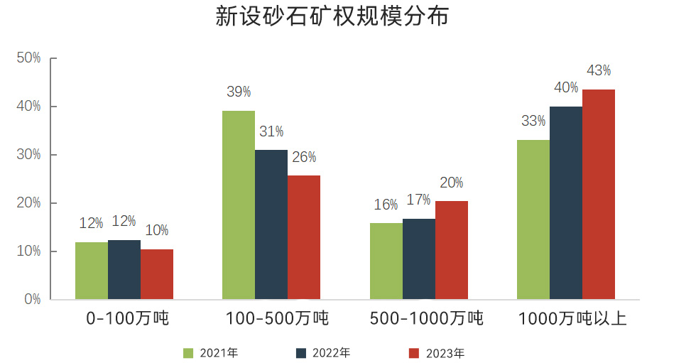新設(shè)砂石礦權(quán)中,資源儲(chǔ)量大于1000萬噸的超大型砂石礦權(quán)、資源儲(chǔ)量在500萬~1000萬噸之間的大型砂石礦權(quán),占比分別提升至43%、20%,占比均較2022年有所提升。另外,資源儲(chǔ)量在100萬~500萬噸之間的中型砂石礦權(quán)占比為26%;資源儲(chǔ)量在100萬噸以下的小型砂石礦權(quán)占比為10%,中型、小型砂石礦權(quán)占比均較2022年有所下降。