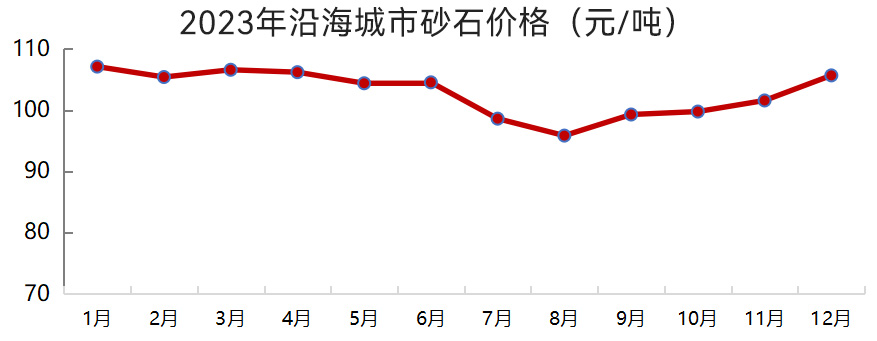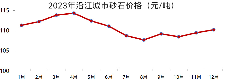 沿江、沿海城市砂石價(jià)格也整體呈下滑趨勢,其中二季度需求偏弱,砂石價(jià)格下滑較為明顯。12月,沿江、沿海城市砂石均價(jià)分別為110元/噸、106元/噸,較2023年年初分別下跌1.3%、1.0%。