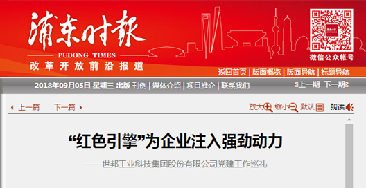 2018年9月7日,浦東時(shí)報(bào)對世邦集團(tuán)黨建工作進(jìn)行了專題報(bào)道。緊抓黨建工作、團(tuán)結(jié)黨員、緊跟黨走,以創(chuàng)新促發(fā)展,以綠色科技守護(hù)環(huán)境,一路走來,我們成績斐然。堅(jiān)決擁護(hù)黨的領(lǐng)導(dǎo),讓黨員組成的“紅色引擎”帶動(dòng)公司向更高的目標(biāo)邁進(jìn)。
