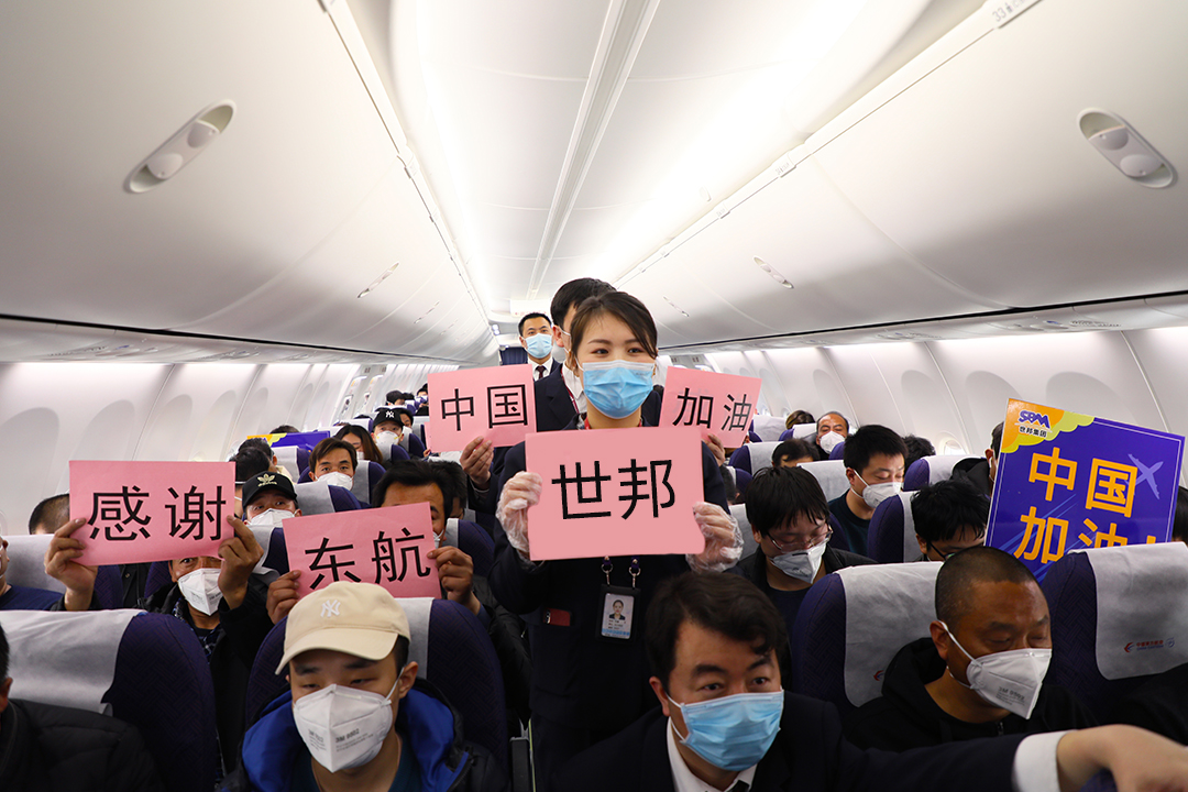 包機(jī)方案確定后,在“世邦疫情防控指揮部”的領(lǐng)導(dǎo)下,多部門緊急聯(lián)動,分工合作,迅速確定乘機(jī)人員信息和接送機(jī)工作。在確定人員信息時,優(yōu)先安排工藝、生產(chǎn)、質(zhì)檢等供應(yīng)鏈生產(chǎn)部門一線職工,爭取盡快恢復(fù)公司產(chǎn)線產(chǎn)能;所有航班搭乘員工,需要經(jīng)過健康安全三級審查,確保疫情防控得到保障。公司派出專車,分散到省內(nèi)各區(qū)縣接員工至起飛機(jī)場集合,東航在機(jī)場出發(fā)廳設(shè)置了專門的接待點,開設(shè)專用值機(jī)柜臺和專用安檢通道,并在登機(jī)口協(xié)助旅客通過手機(jī)線上填寫健康申報表。在候機(jī)樓和登機(jī)口分別對搭乘人員進(jìn)行體溫測量。航班上,F(xiàn)M9390航班機(jī)長通過廣播為這趟航班給予特殊致辭,勉勵大家“一同共克時艱,迎接春暖花開”。