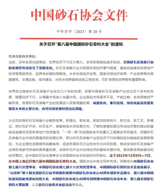 2023年12月5日-7日,由中國(guó)砂石協(xié)會(huì)主辦,世邦工業(yè)·黎明重工承辦的“第八屆中國(guó)國(guó)際砂石骨料大會(huì)”將于上海市浦東新區(qū)召開(kāi)。