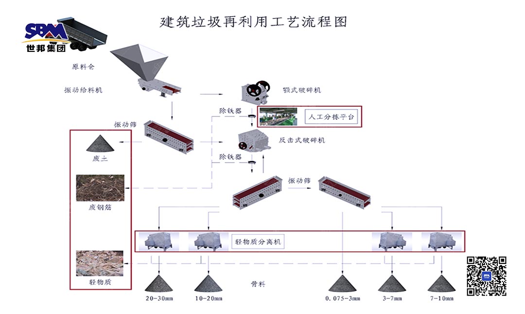 整個流程通過“破碎-分選-篩分-分離”組合工藝,實現建筑垃圾的高效資源化利用,產出再生骨料及可回收物,減少環境污染。