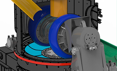 主電機通過減速機帶動磨盤轉動,同時熱風從進風口進入立磨機體內,物料從下料口落到磨盤中央并在離心力的作用下從磨盤中央向邊緣均勻移動,經過磨盤的輥道粉磨區域時,受磨輥的碾壓,大塊物料直接被壓碎,細粒物料受擠壓后形成料床進行粒間粉碎。被粉碎的物料繼續向磨盤邊緣移動,直到被風環處的強氣流帶走,而較大的顆粒物料又重新掉落到磨盤上繼續粉碎,氣流中的物料經過上部分離器時,在轉子葉片的作用下,粗顆粒重新回到磨盤上粉磨,合格的細粉隨氣流一起出磨,被系統的集粉器收集并排出即為成品粉體。混入物料的鐵塊等雜物隨物料運動至磨盤邊緣時,由于自身重量大跌落至磨機下腔,并被安裝在磨盤底部的刮料板刮入排渣口排出機外(俗稱吐渣)。