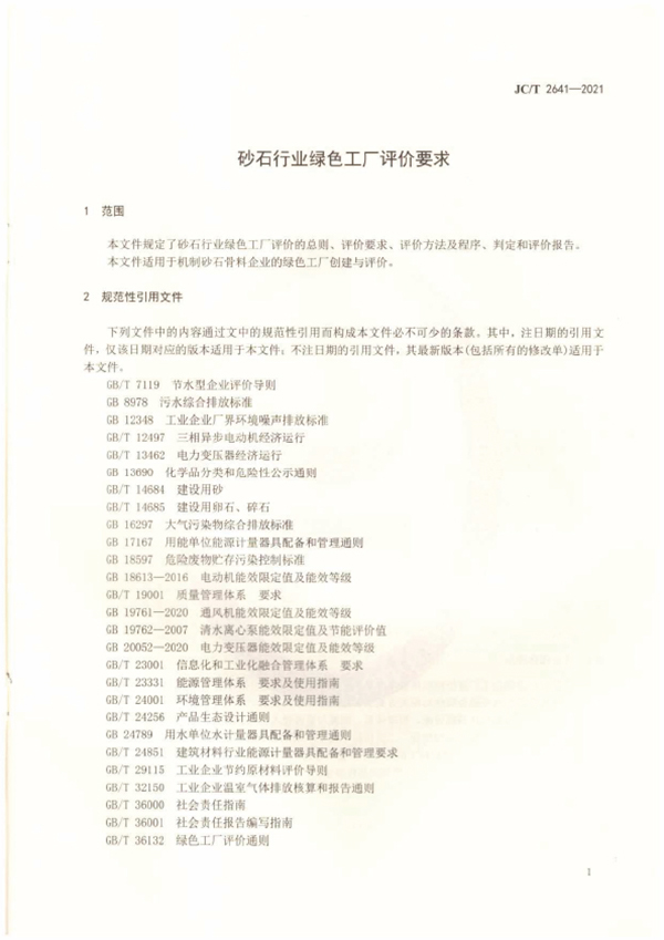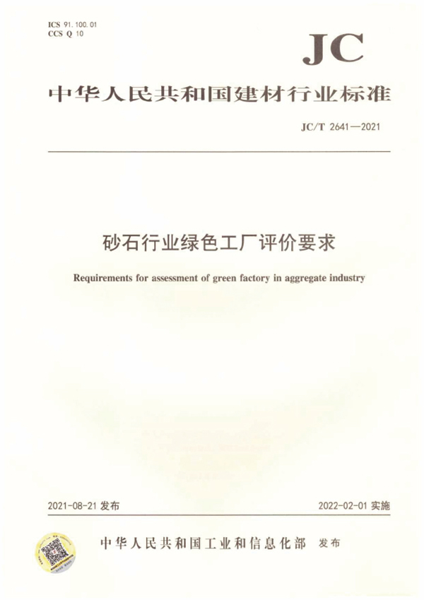 本標準根據砂石行業特點及綠色發展趨勢,以節能、減排、綠色、低碳為核心,圍繞行業先進技術、裝備、管理等方向,制定了綜合全面的砂石行業綠色工廠評價指標體系,適用于機制砂石骨料企業的綠色工廠創建與評價。