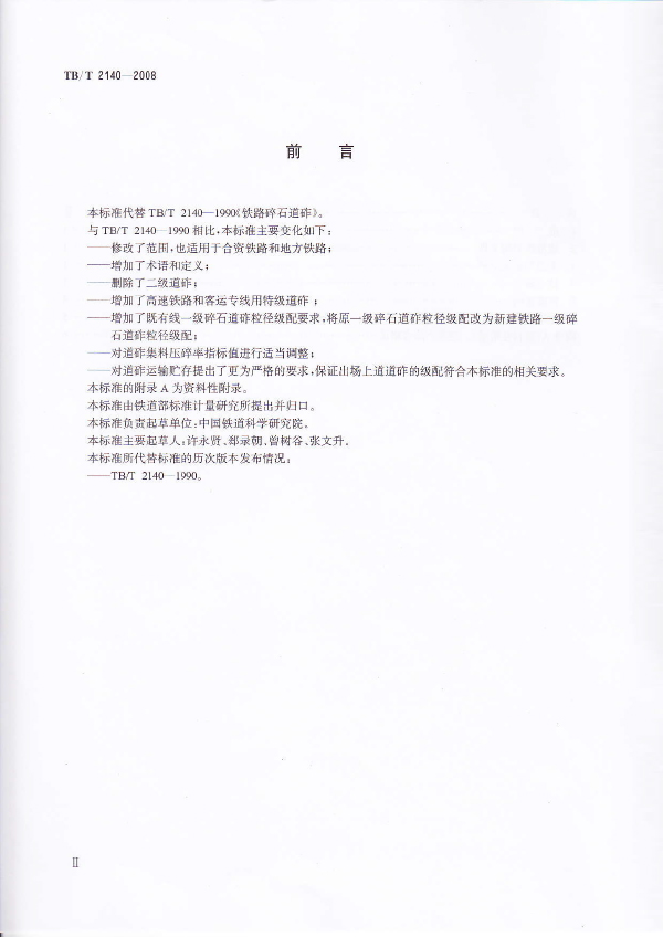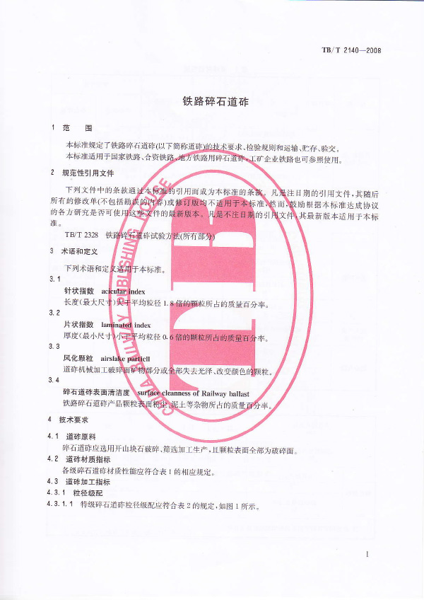 本標準規定了鐵路碎石道砟的技術要求、檢驗規則和運輸、貯存、驗交。明確對道砟粒徑、級配、顆粒形狀及清潔度的檢驗指標;對道砟集料壓碎率指標值做出規范;對道砟運輸貯存提出了更為嚴格的要求,保證出場上道道砟的級配符合本標準的相關要求。