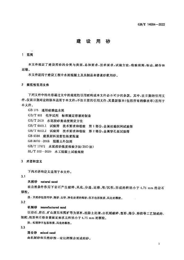 該標準規定了建設用砂的分類、試驗檢驗、標志、儲存和運輸的規則,適用于建設工程中水泥混凝土及其制品和普通砂漿用砂。